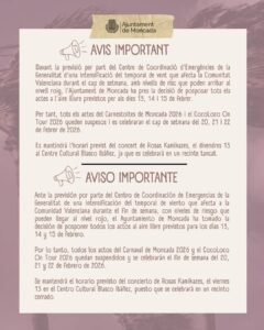 El ayuntamiento de Moncada ha emitido a última hora de esta tarde un aviso por el que suspenden los actos de carnaval previstos para este fin de semana