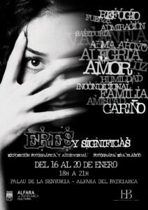 Este viernes 16 de enero inaugura en el Palau de la Senyoria de Alfara del Patriarca a las 18:00 horas su primera exposición ‘Eres y significas’. La muestra permanecerá abierta al público hasta el día 20 en horario de 18:00 a 21:00 horas.