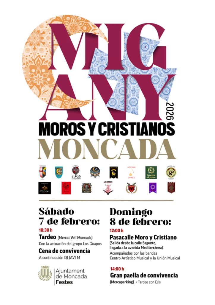 Moncada celebra aquest cap de setmana la Festa del Mig Any de Moros i Cristians. Els actes donaran inici el dissabte 7 a les 18:30 hores amb el tardeo en el Mercat Vell amb l’actuació del grup Los Guapos al qual seguirà el sopar de convivència amb l’actuació del DJ Javi M.