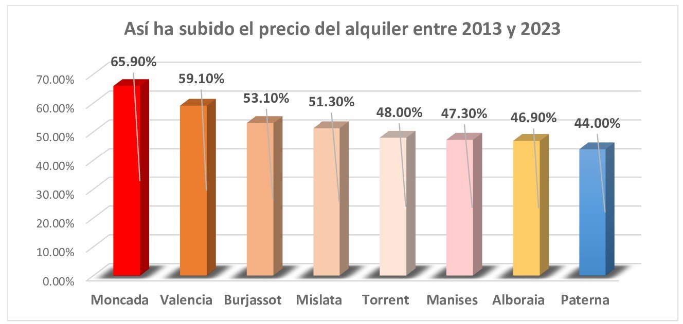 En este ranking de municipios donde más se ha incremento el precio del alquiler en una década, Moncada se codea a nivel nacional con las ciudades turísticas de Ibiza, Santa Eulària des Riu y Sant Josep de sa Talaia, todos de las Islas Baleares que han visto aumentar sus precios un 70%, 68% y 66% respectivamente. Moncada le pisa los talones con apenas una décima, 65,9%.