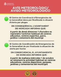 Pasadas las 00:00 horas de este martes la Agencia de Seguridad y Emergencias de la Generalitat emitía una actualización de la alerta meteorológica en la que decretaba el fin de alerta por lluvias nivel rojo y pasaba a activar el nivel amarillo.