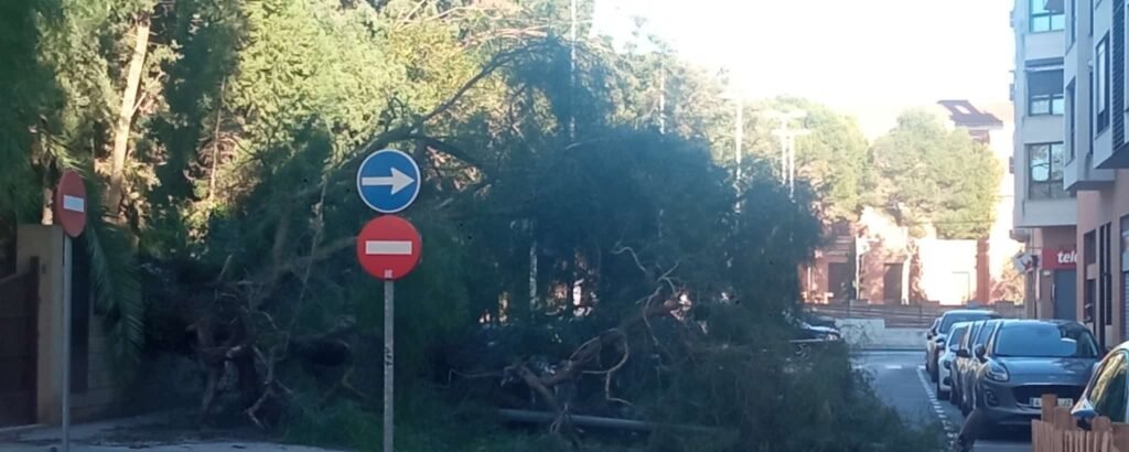 El temporal de fuertes vientos registrado en Moncada durante toda la jornada del sábado ha dejado numerosas incidencias a última hora de la tarde, especialmente en la zona de Masías, donde las rachas de vientos han provocado la caída de varios árboles.