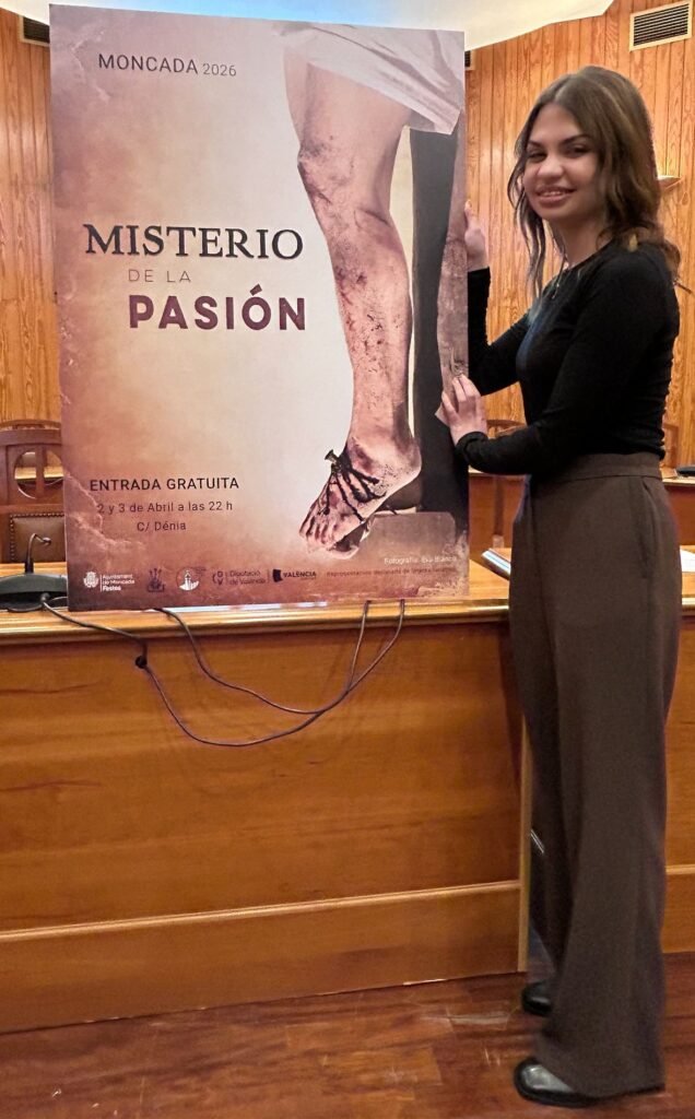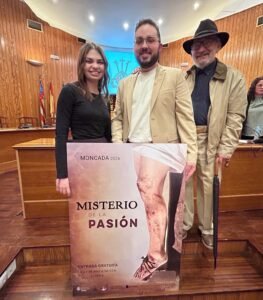 Moncada ha presentado el cartel anunciador del Misterio de la Pasión, obra de Eva Blanco quien ha manifestado que «con el detalle de la crucifixión con los clavos en los pies de Cristo he querido transmitir el momento de la esclavitud«. Se trata de una imagen realista de Jesús en la cruz con la que la fotógrafa de Alfara del Patriarca ha cautivado al público que ha llenado el salón de sesiones del ayuntamiento.