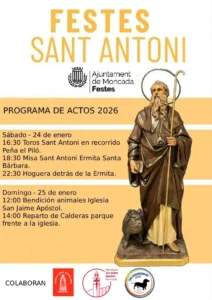 Por lo que respecta a la fiesta de sant Antoni la programación dará comienzo el sábado 24 de enero a las 16:30 horas con los actos taurinos de la Peña El Piló. Posteriormente se celebrará la misa en honor a Sant Antoni en la Ermita de Santa Bárbara, y a las 22:30 horas, tendrá lugar la tradicional hoguera, ubicada detrás de la ermita.