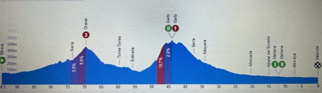 La salida de este domingo es a las 14:30 desde Bétera con subida al GarbÍ a 40 km de meta punto en el que hay que esperar que la etapa se dinamite. Habrá que ver si se forma una fuga o el vencedor del día se decide al sprint.