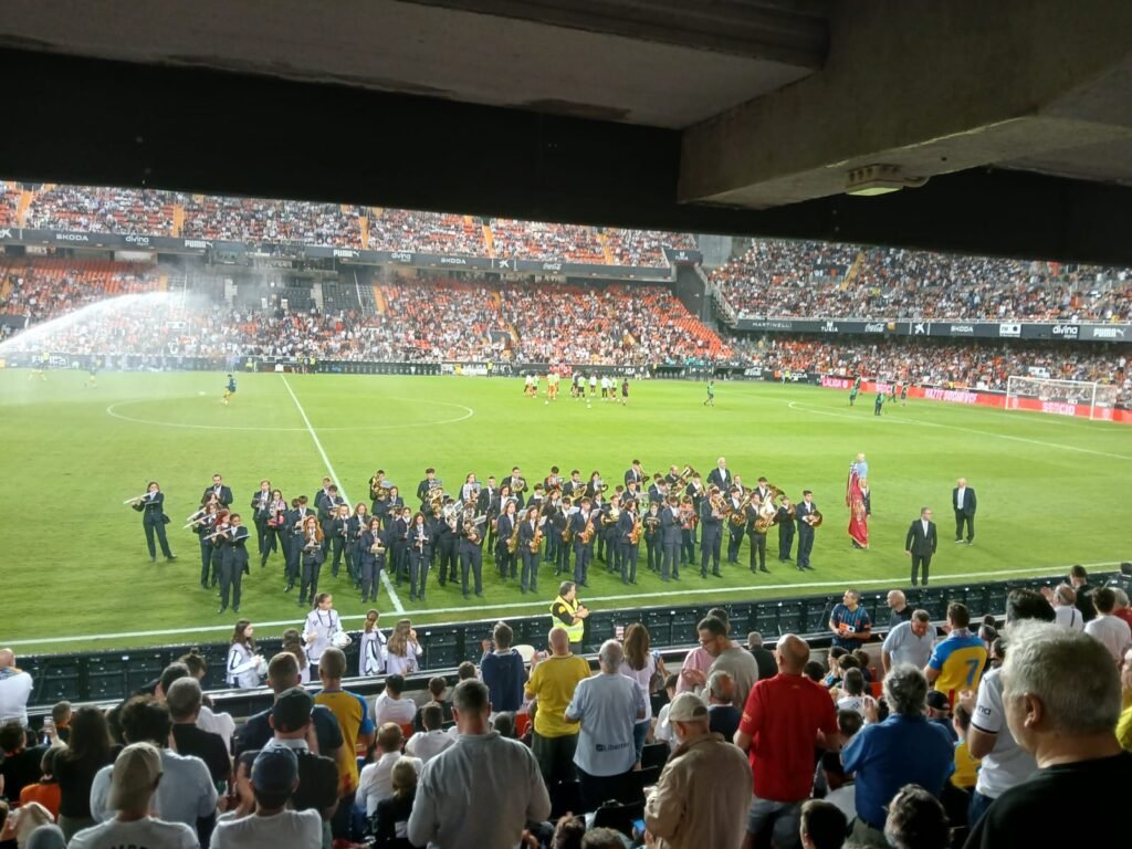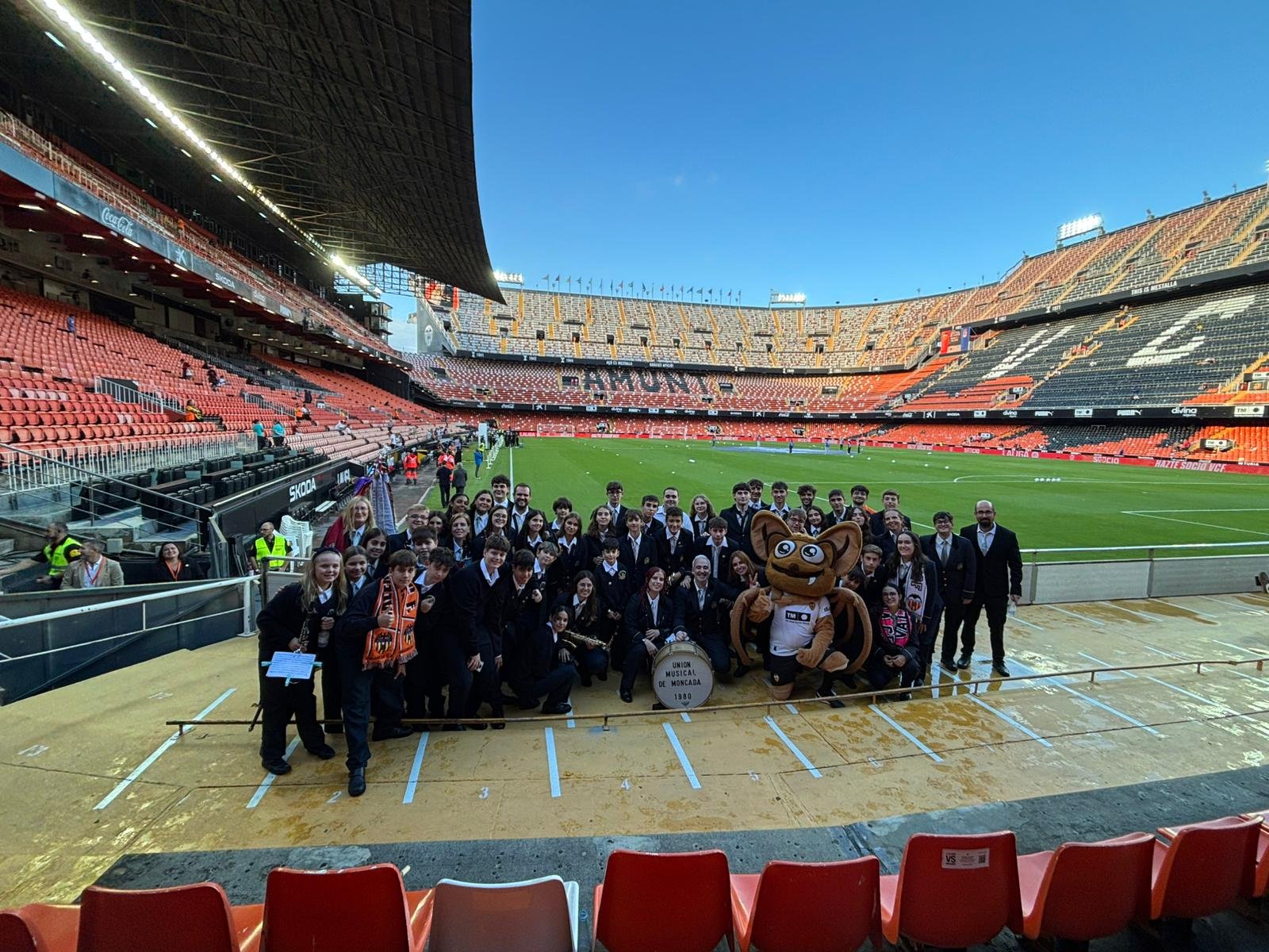 La Unió Musical de Moncada ha celebrado este lunes en Mestalla su 45 aniversario en el partido de Liga que han disputado Valencia CF y Real Oviedo.