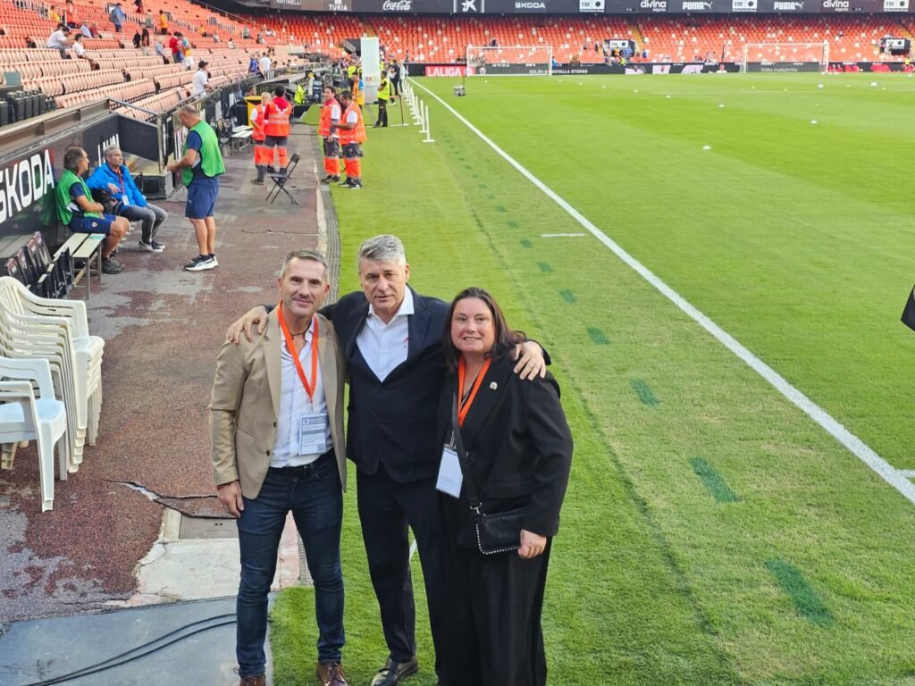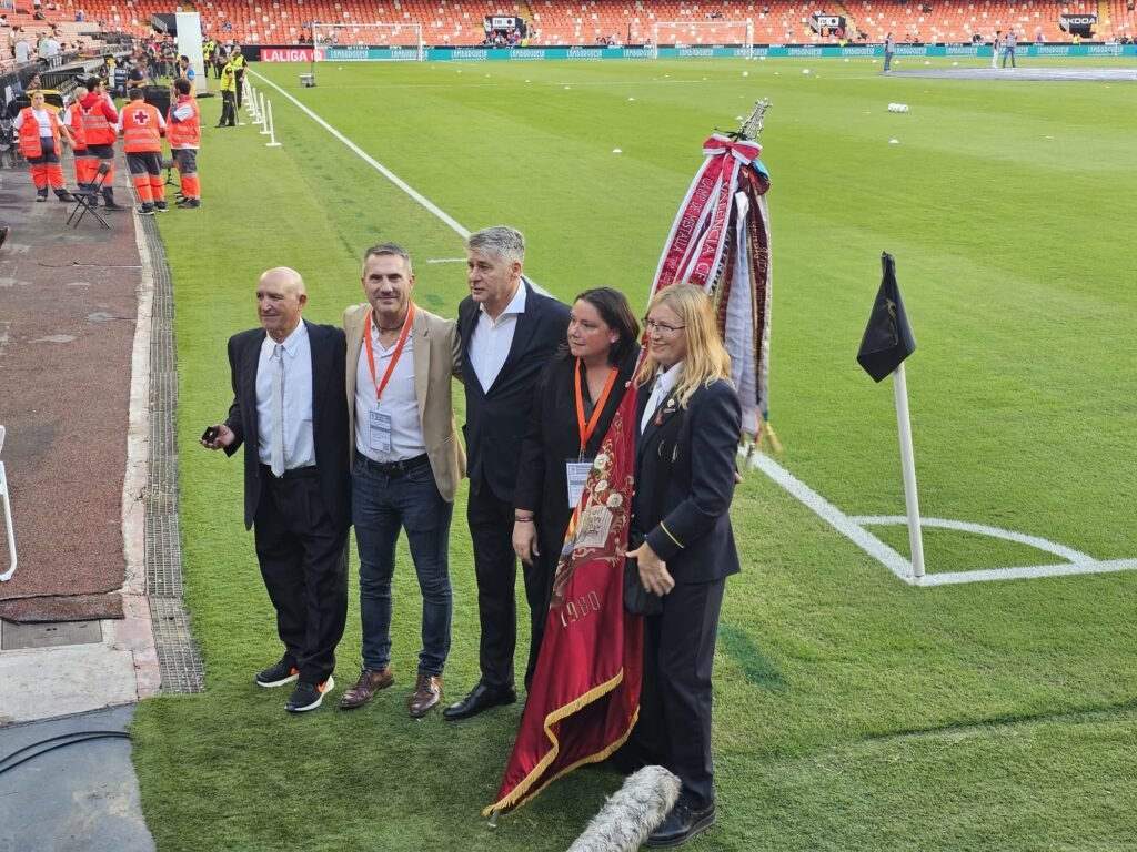 Al palco de Mestalla han acudido la presidenta Lola Canales y el concejal de deportes Martín Pérez. El moncadense e internacional Miguel Tendillo, actual delegado del Valencia CF ha impuesto el corbatín a la bandera de la Unió en recuerdo de su visita a Mestalla.