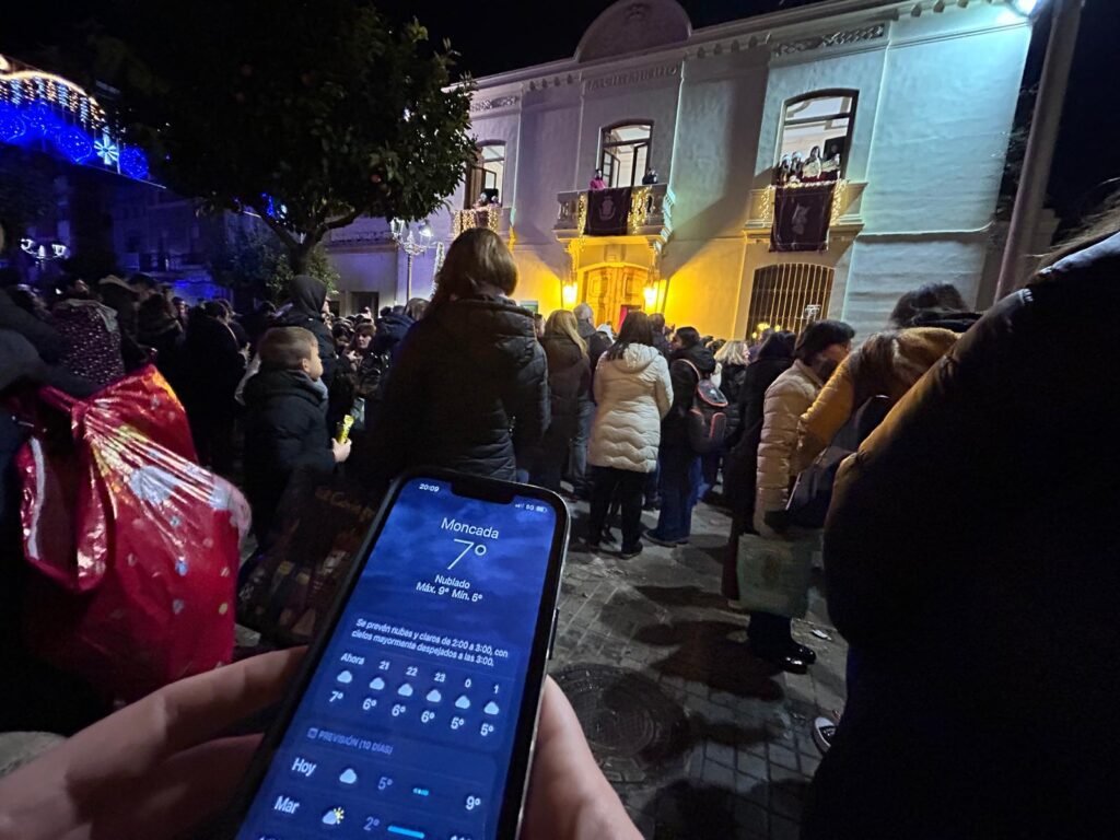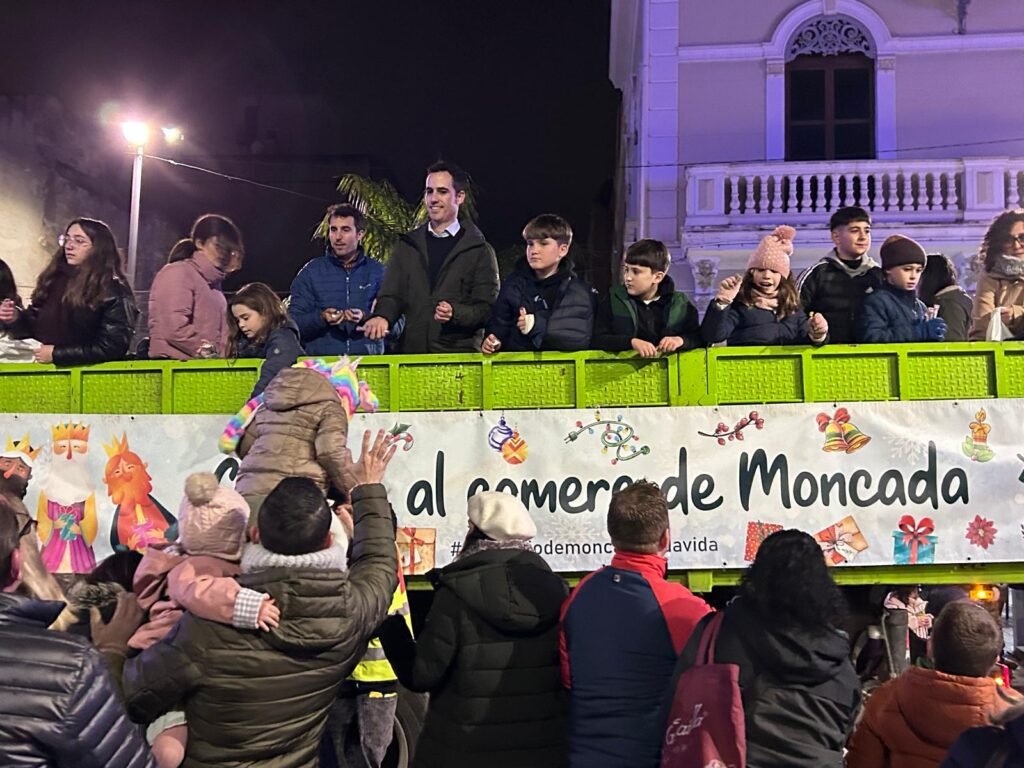 Mas de 3.000 personas -según fuentes municipales- han desafiado este lunes por la tarde a un intenso frío (siete grados sobre cero), pero sin que la lluvia hiciera acto de presencia, en la Cabalgata de los Reyes Magos de Oriente, Melchor, Gaspar y Baltasar, celebrada en Moncada.