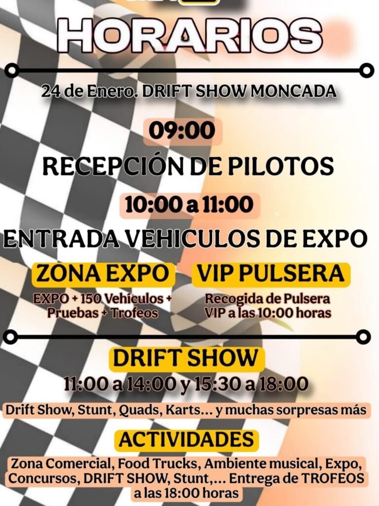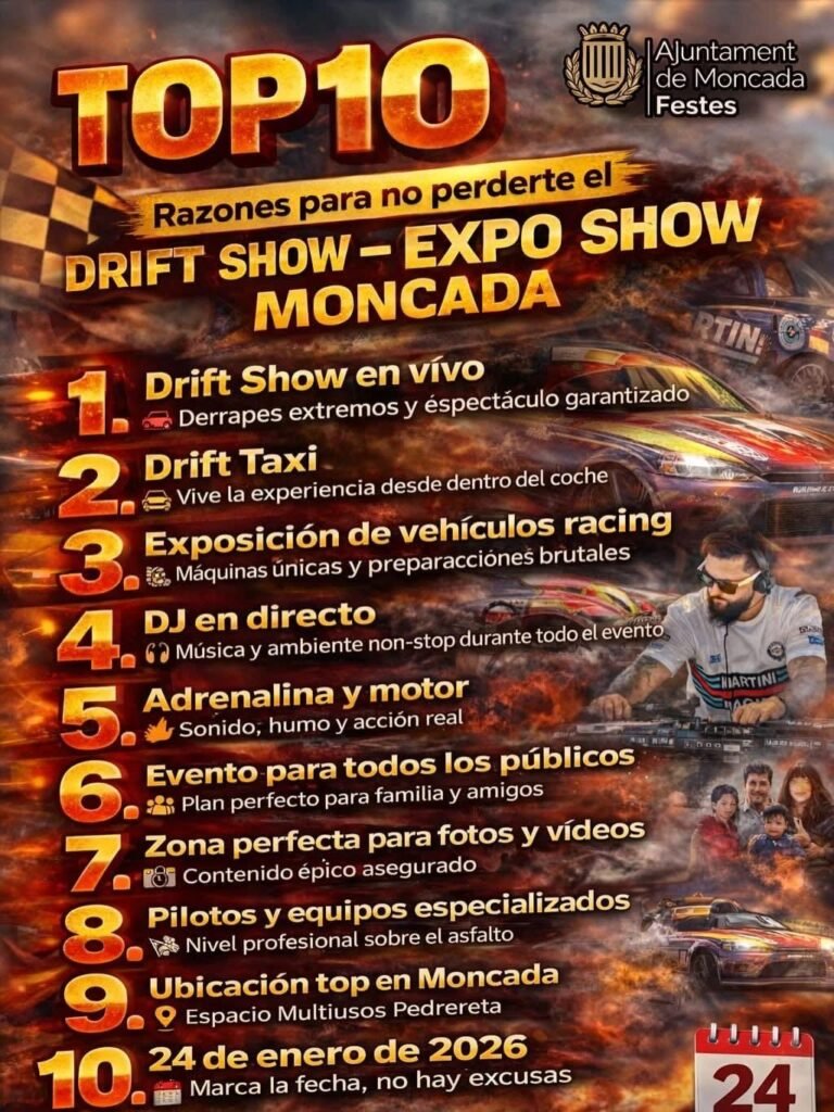 El rugido de los motores y la adrenalina del automovilismo se apoderarán de Moncada este sábado 24 de enero. La cita será en el Espai Multiusos La Pedrereta de 11:00 a 22:00 horas que ya está listo para acoger la edición del esperado «Drift Show», un evento que promete reunir a cientos de aficionados al motor y las exhibiciones de conducción.