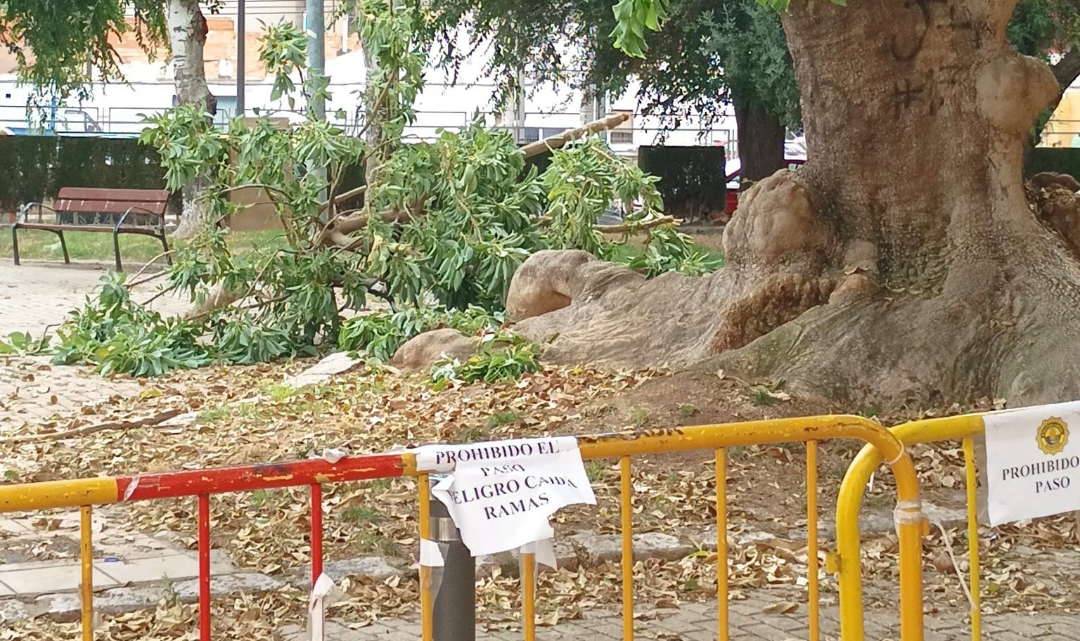 El parque lleva ‘cerrado’ 3 semanas con una valla de la policía local que indica «prohibido el paso por caída de ramas», aunque todo el perímetro no esta cancelado por lo que se puede acceder fácilmente al mismo con el riesgo de que muchos ramajes que cuelgan de los frondosos árboles se desprendan y puedan causar más daños.