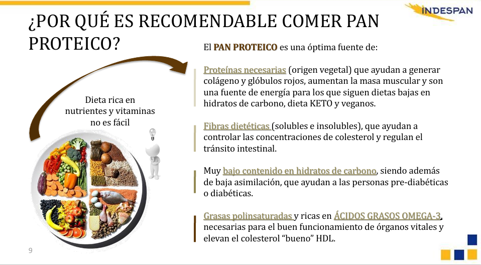 Además este pan proteico contiene unas altas proporciones de fibras dietéticas y de omega 3 por lo que contribuye a la salud de toda la población.