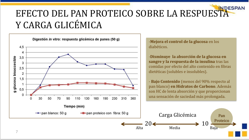 El sector de la panaderia tambien está presentando un auge en los panes y derivados con alto contenido en proteínas. En la empresa Indespan se ha realizado un estudio científico encaminado a la obtención de panes proteicos y cuyos resultados son muy atractivos para la salud del consumidor. Así, se realizaron pruebas en un digestor clínico que simula el comportamiento de nuestro sistema digestivo asi como la curva de glucemia que se consigue al consumir este pan proteico (fig. 1) Como se puede observar en la Fig.1 la absorción de glucosa en sangre disminuye drásticamente, efecto muy beneficioso para todos y especialmente para los que tienen que controlar su azúcar en sangres como son los pacientes con prediabetes o diabetes.